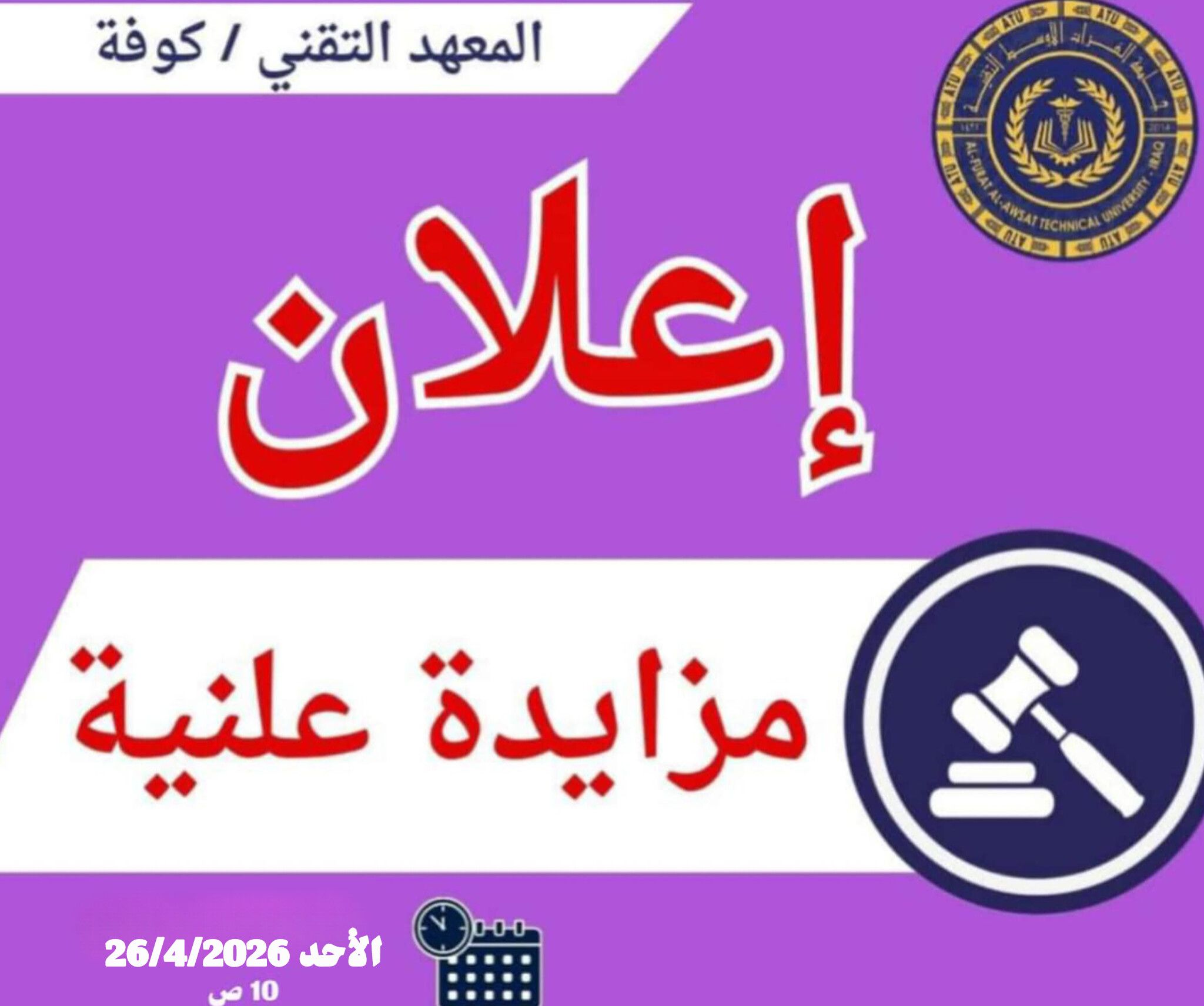 أعلان مزايده علنية اعلن عمادة المعهد التقني / كوفة أحد تشكيلات جامعة الفرات الأوسط التقنية عن إجراء مزايدة علنية لتأجير ( ساحة وقوف السيارات ) العائدة للمعهد / موقع رئاسة جامعة ا...