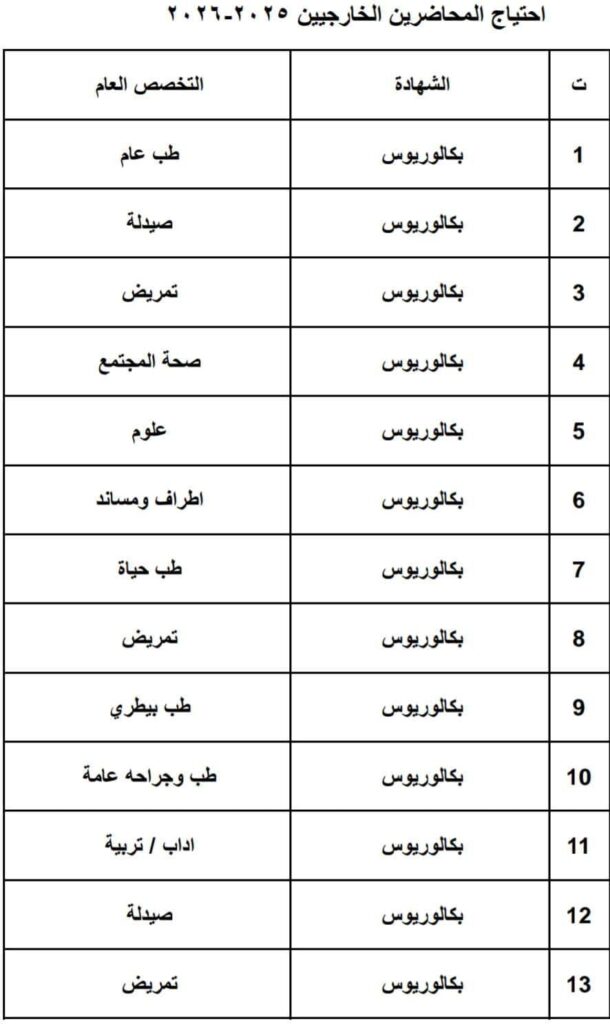 عن حاجته إلى محاضرين خارجيين للعام الدراسي 2025–2026