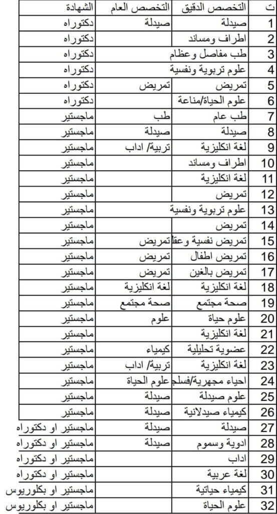 في التخصصات المبينة أدناه ، للعمل بصفة محاضر خارجي.