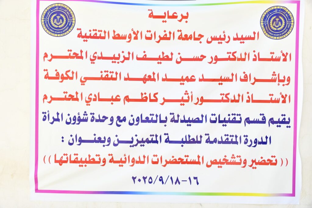 و بالتعاون مع وحدة شؤون المرأة إختتم قسم تقنيات الصيدلة في المعهد التقني / كوفة دورة تدريبية متقدمة بعنوان ” تحضير و تشخيص المستحضرات الدوائية و تطبيقاتها “